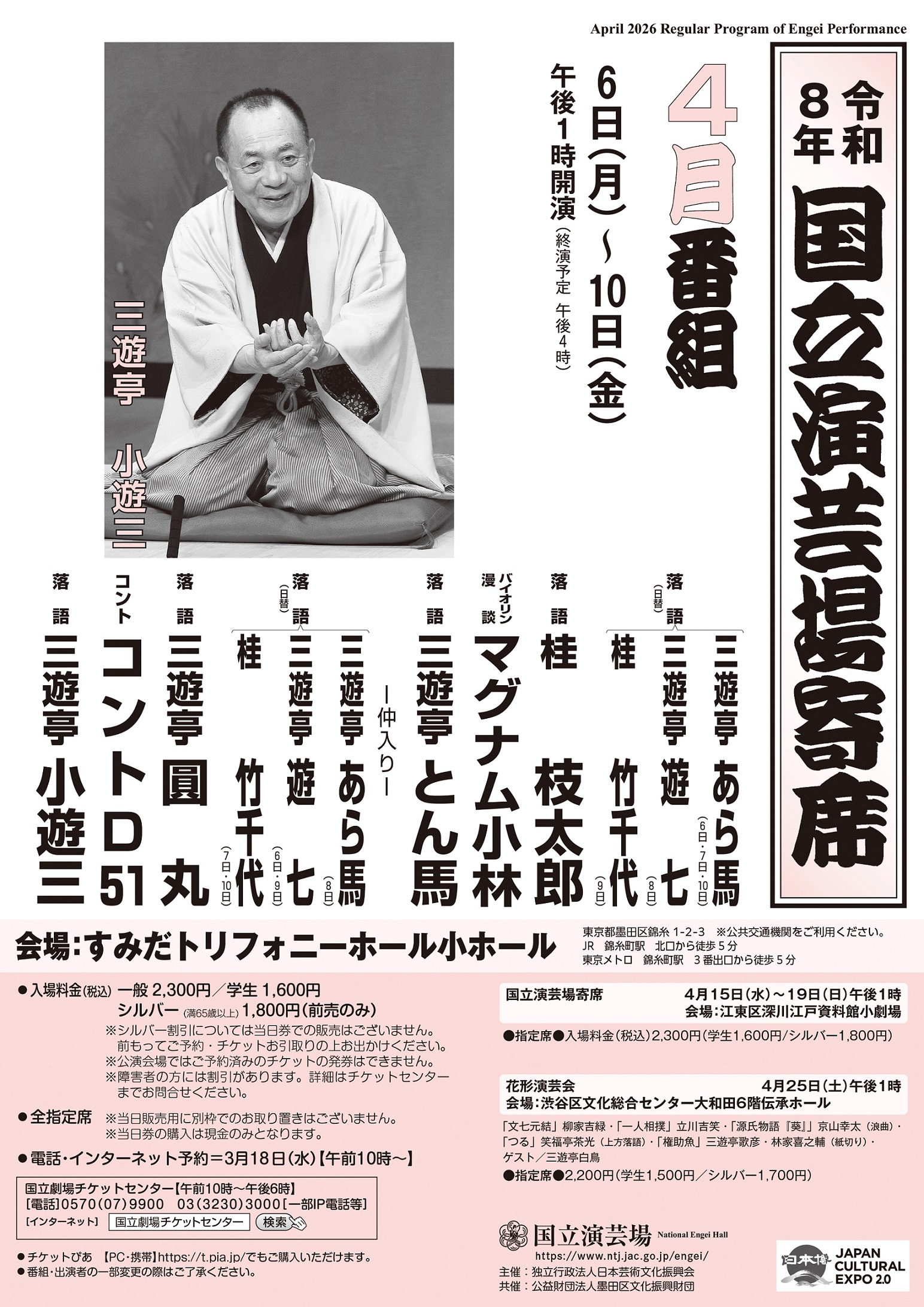 4月国立演芸場寄席(6日~10日)の出演者が決定しました。