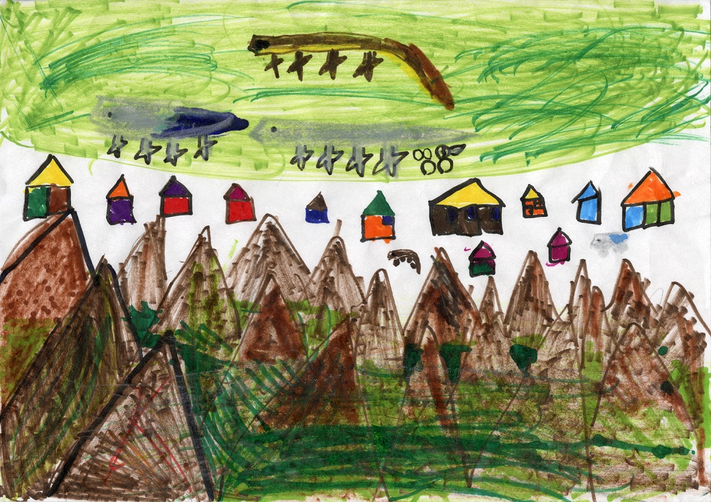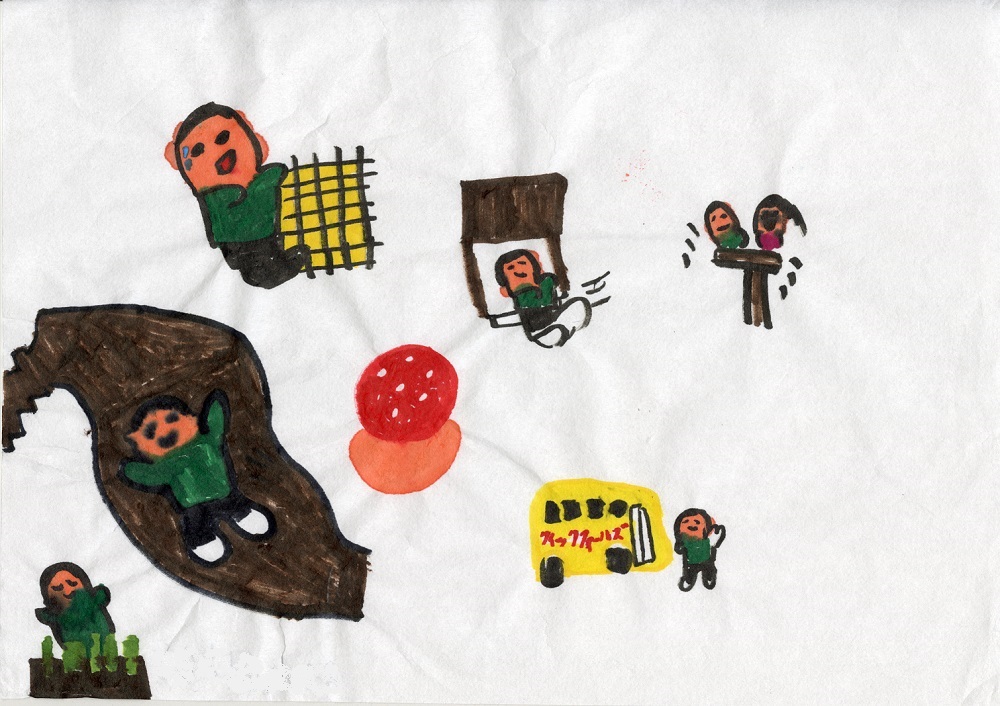 - 自ぜんのかんきょうをイメージした絵をかきました。この絵には、空や土をかこうと思いました。けれど、土の中にはモグラやアリなどがいたかなと自分のそうぞうの絵をかきました。