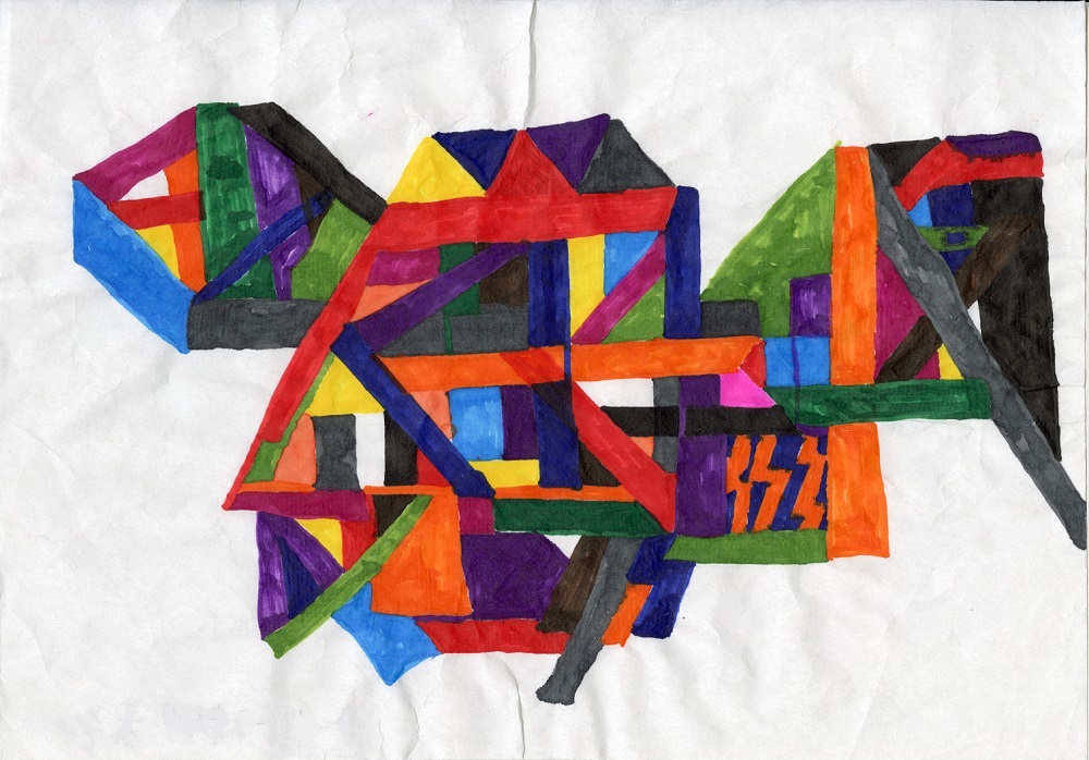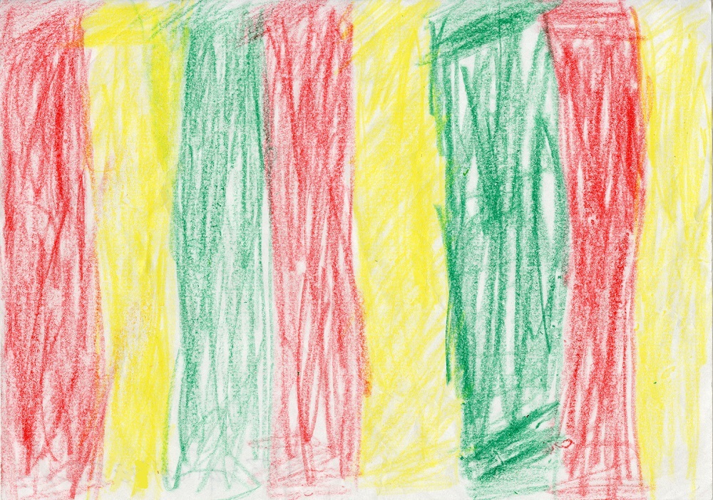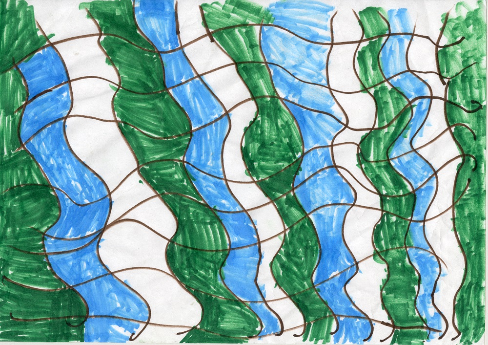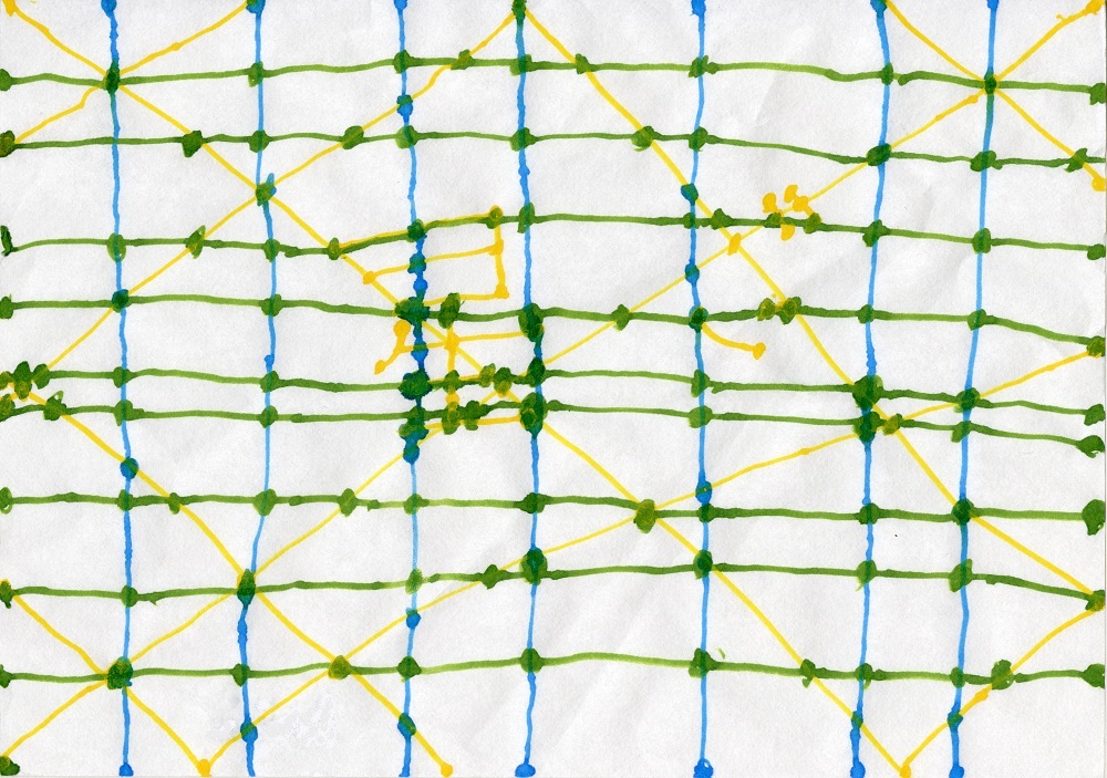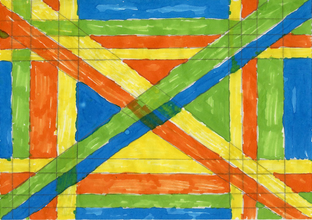 - この作品はたてとよこに線があってナナメにも線があります。たて、横、ナナメの線はうすい色とこい色の黄色と黄みどり色、水色とオレンジ色をつかいました。
