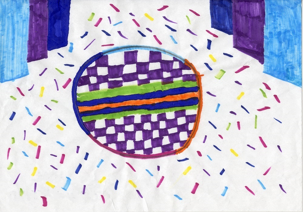 - このまくは、まるの中のもようがカラフルなので「カラフルまく」にしました。中のもようは、わたしのすきな水色としまもようにしました。まわりにあるもようはカラフルスプレーをイメージしました。