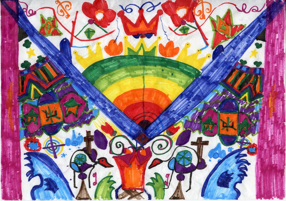 - 赤・黄色・緑色をつかったまくです。なぜこの色にしたかというと、赤は明るいからじゃきから守ってくれる。黄色は明るいから星のようにかがやける。緑色はさいがいから守ってくれる。そんな気がしたのでこのまくを作りました。