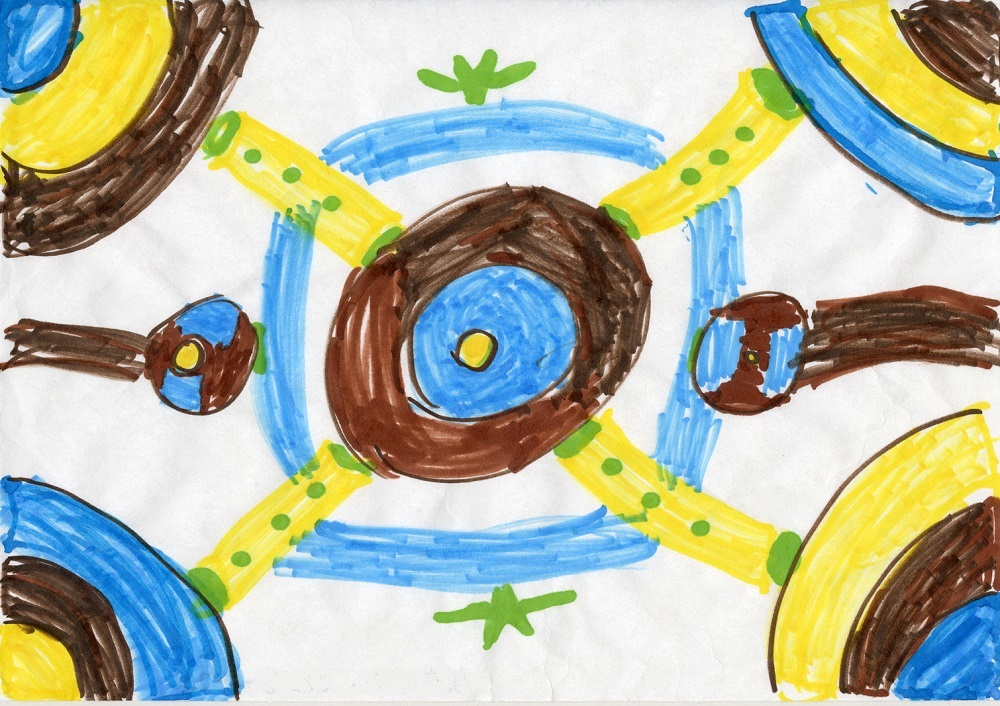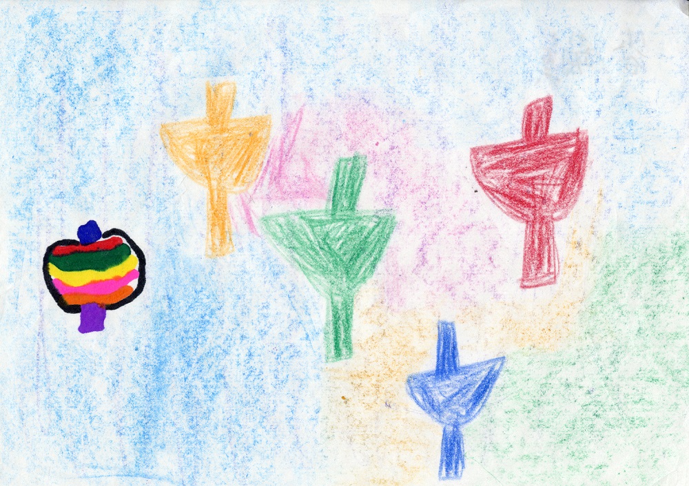 - この作品は、いろいろな色のコマをえがいた絵です。コマ回しがとくいなので、この絵をかきました。ぜんぶ一しょの色ではなく、一つ一つちがう色にすることできれいに見えるようにしました。