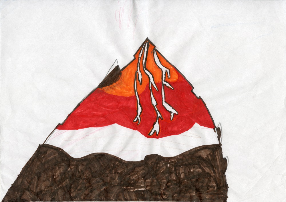 - その名の通り、「今にもふん火しそうな火山」をえがいています。上のほうは赤く下したのほうは、茶色く、上に火があるかんじを出しています。