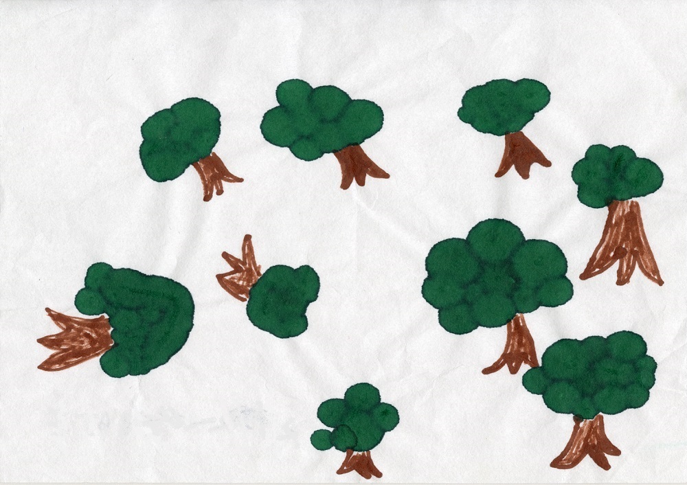 - ぼくはかぞくでながのけんによく行きます。そこで、木や自然を見たりかんじたりします。その自然をかきたいと思いました。作品は、カラーペンをずっとそのままの場所で先のほうをつけてだんだんと広がってくるのが木のはっぱににあうと思ってかきました。