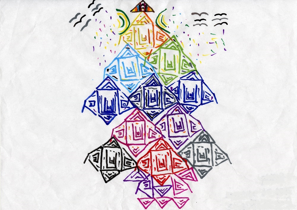 - くふうしたことは、一つ一つすこしずつもようをちがくしたところです。名前の由来は自分もわからないもようをたくさんかいたのでなぞのもようのまくという名前にしました。このもようは、あらしのあいだから神が出てくるというイメージでかきました。なぞのもようをじょうしきまくとしてかいたりゆうは、なぞなぞもようは、ぜんぶ一本の線で作っているので、じょうしきまくとしてかきました。