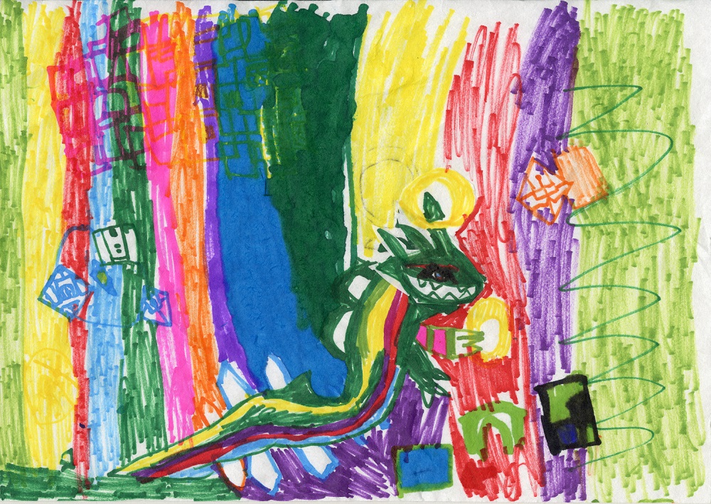 - このさくひんのドラゴンは、この作品の前にかいたドラゴンがかおを上からはりあわせているので、うしろのかおと前のかおがちがい、2まい目のドラゴンが色をきゅうしゅうしたすがたなので「二面ドラゴン」となづけました。