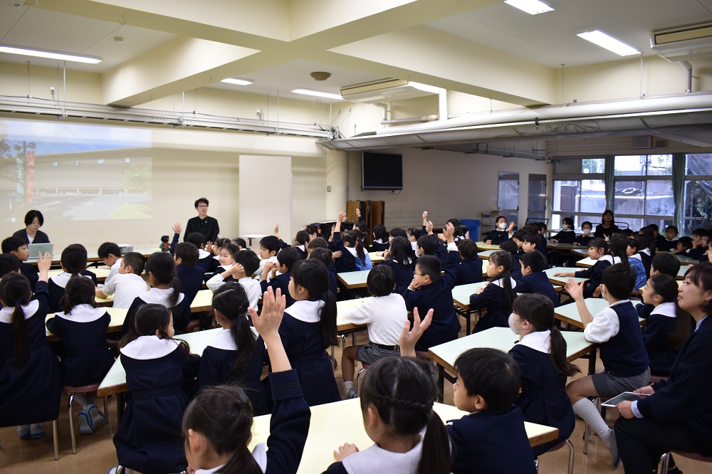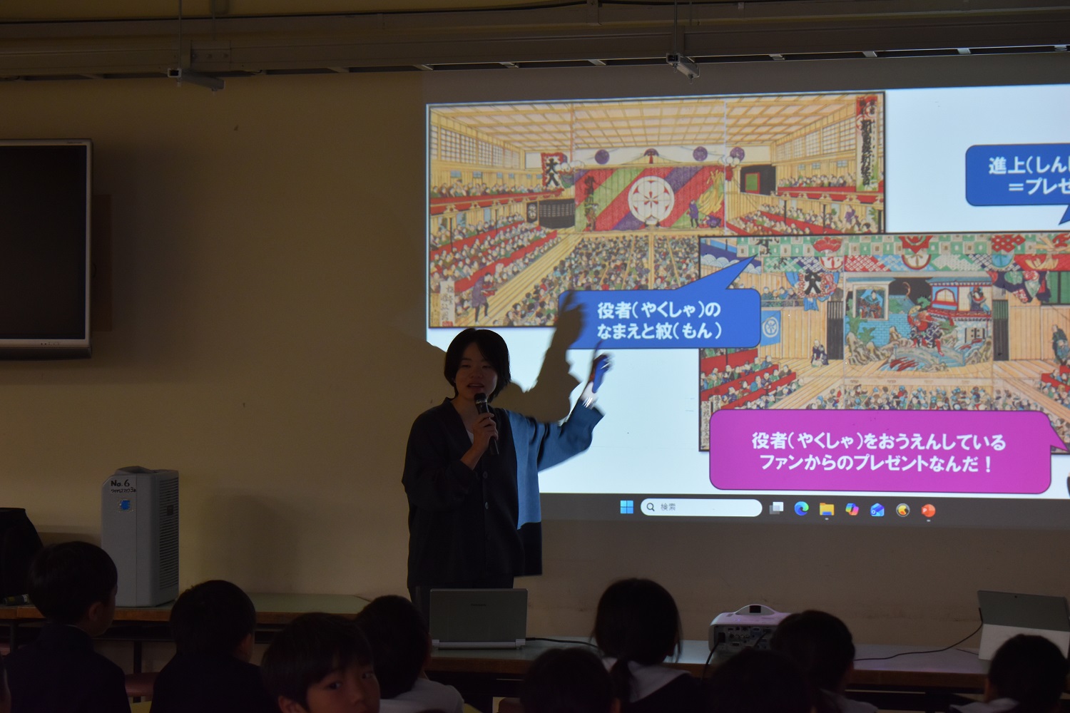 このあと埋忠先生が映してくれたいろいろなおくりものの幕のデザイン画に、「きれいー!」、「あのマークおにぎりに似てる!」などなど思い思いの感想が飛んだよ。鮮やかな絵柄ばかりで、これが大きな幕だったら目をうばわれちゃうな。