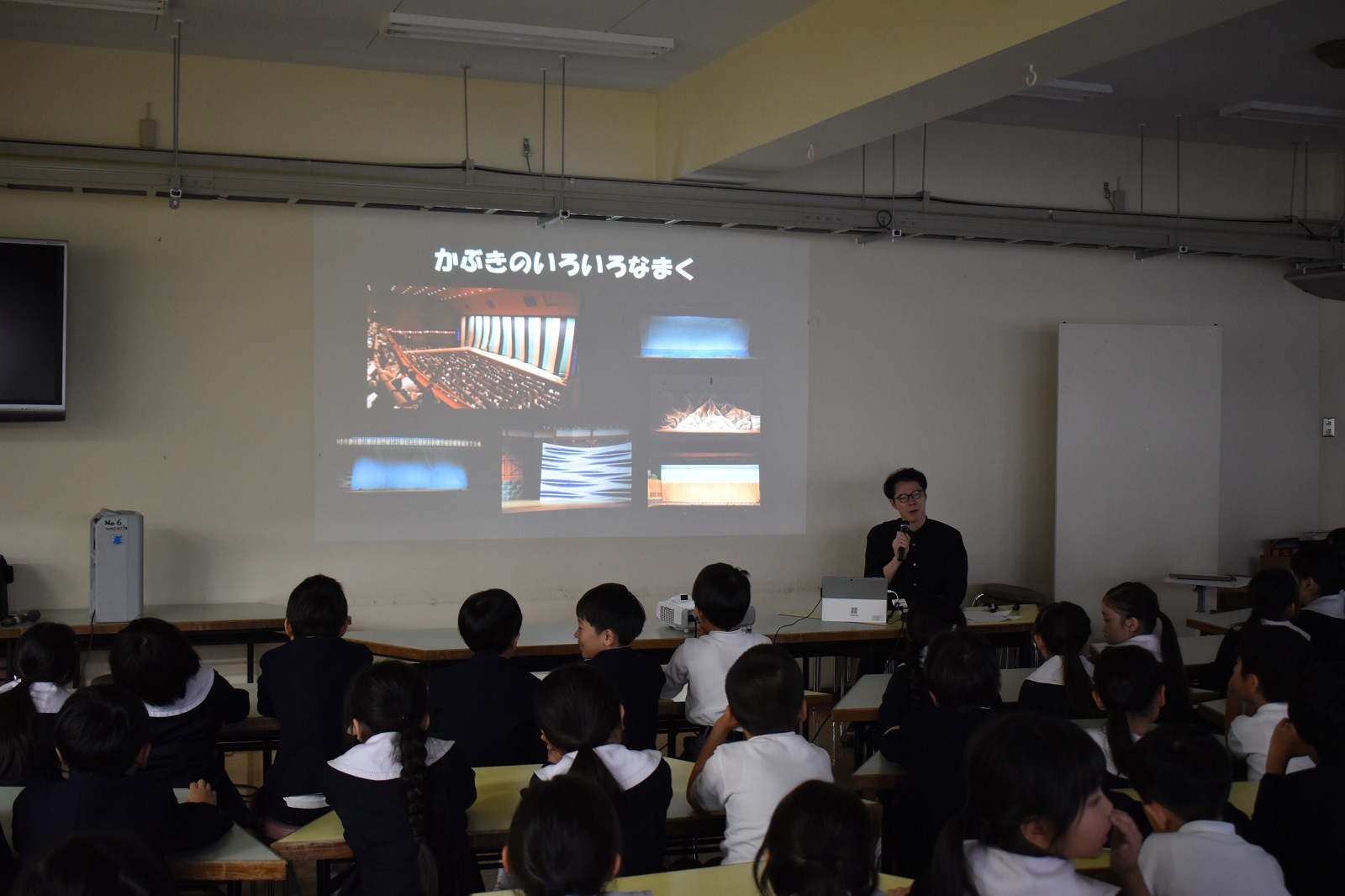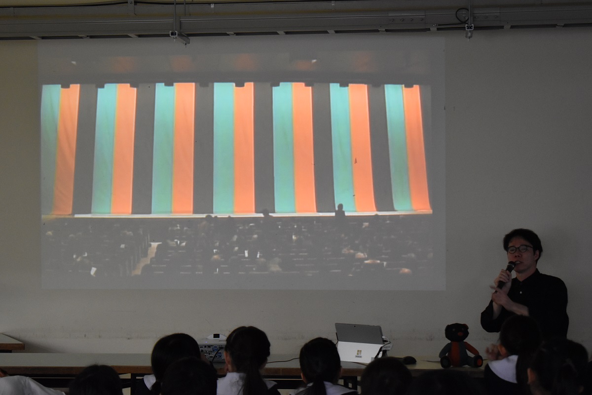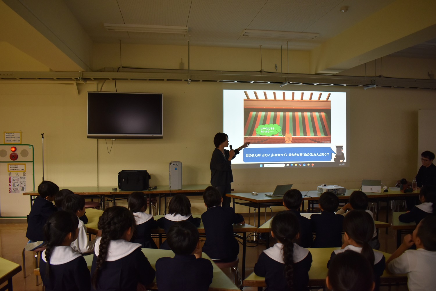 全体の授業者は、お茶小図画工作科の小沼律子先生。そして、今回の話し手はお茶の水女子大学の埋忠美沙先生と、国立劇場の展示や資料の調査を担当している横山陽一さんだよ。