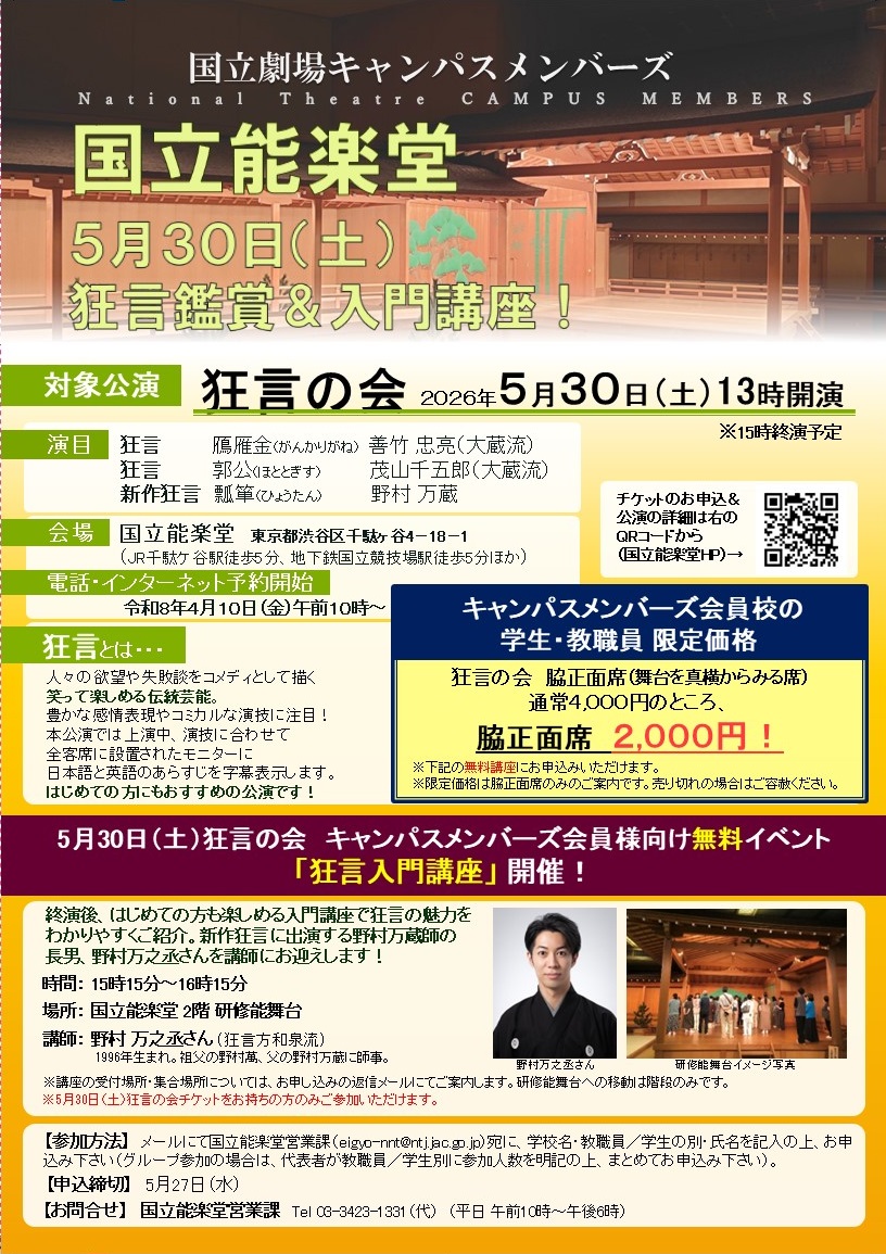 ②メールにて国立能楽堂営業課(eigyo-nnt@ntj.jac.go.jp)宛に、学校名・教職員/学生・氏名を記入の上、お申込み下さい。