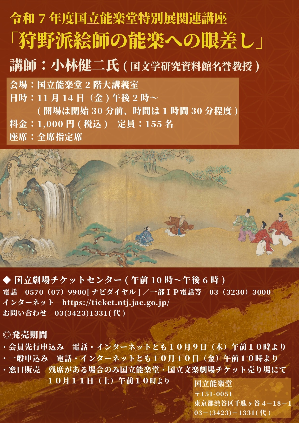 ◎会員先行申込み 電話・インターネットとも 10月9日(木)午前10時より ◎一般申込み 電話・インターネットとも 10月10日(金)午前10時より ◎窓口販売 残席がある場合のみ国立能楽堂・国立文楽劇場チケット売り場にて 10月11日(土)午前10時より |