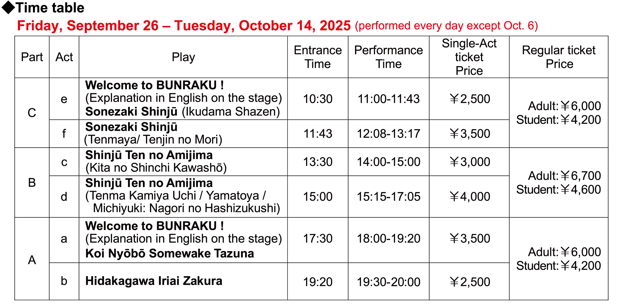 Our regular tickets are to appreciate a whole part of the performance. In addition, we provide singleact tickets to see only one act in short time and at affordable prices. Just drop in and enjoy Bunraku!!