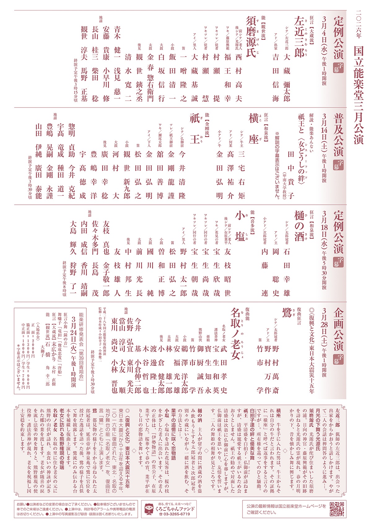 ※国立能楽堂チケット売場窓口・自動発券機は国立能楽堂主催公演日(*)のみの営業(午前10時~午後6時)です。*販売開始は電話・インターネット予約開始日の翌日以降