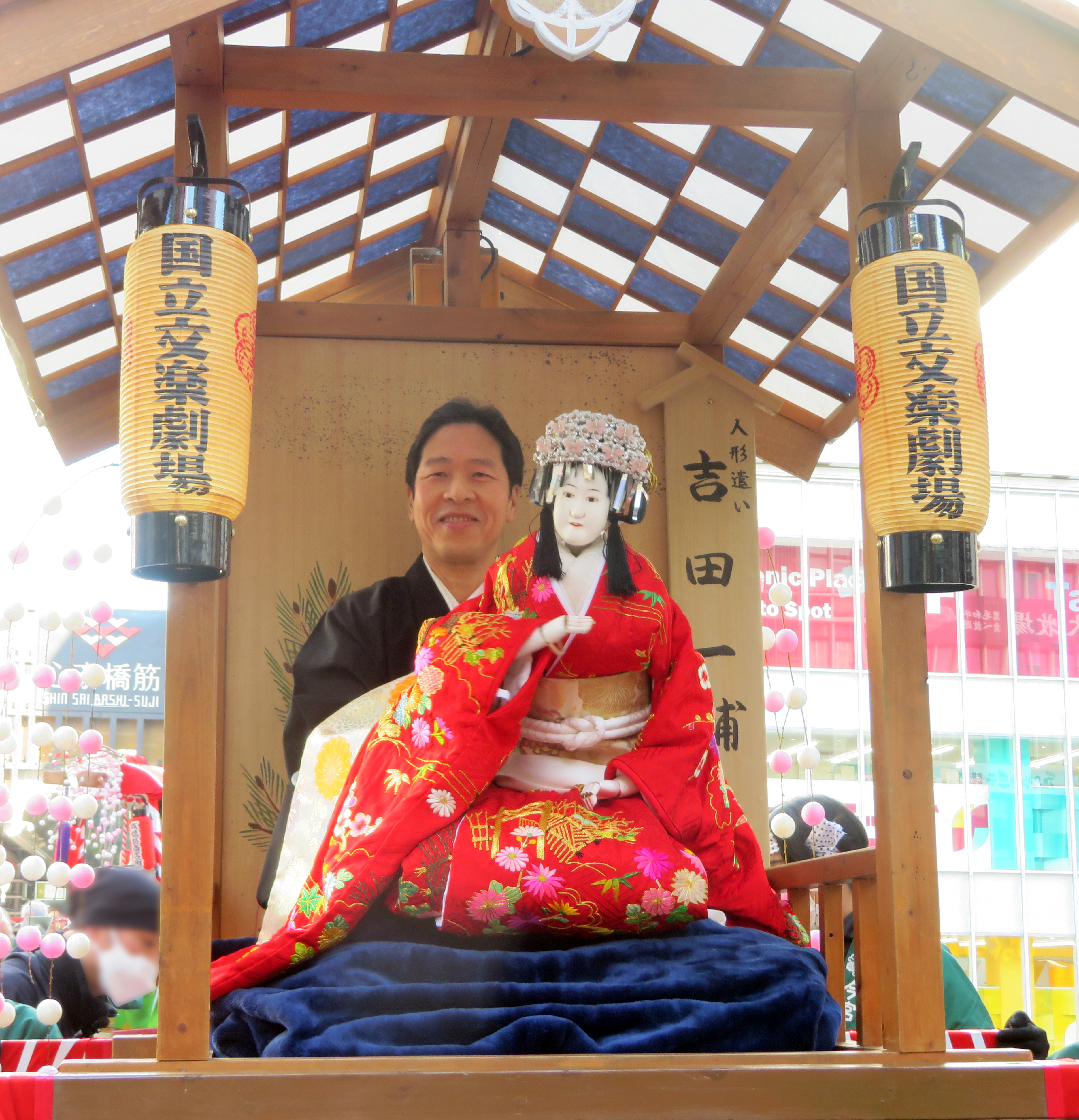 国立文楽劇場からは吉田一輔が文楽人形とともに駕に乗り、大勢の方々からの声援に応えながら、人形浄瑠璃文楽をPRいたしました。