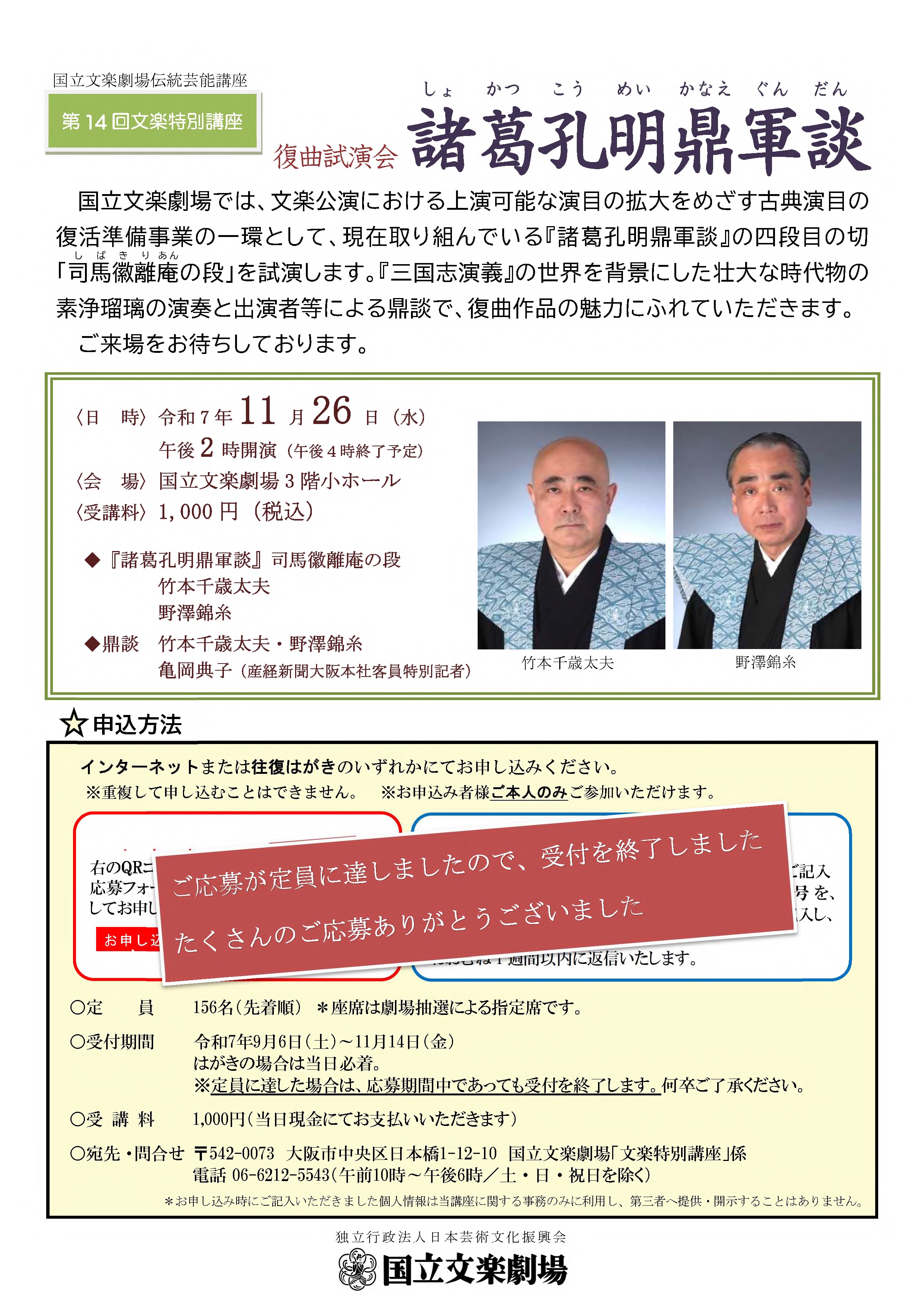 第14回文楽特別講座 復曲試演会「諸葛孔明鼎軍談(しょかつこうめい かなえぐんだん)」開催のお知らせ