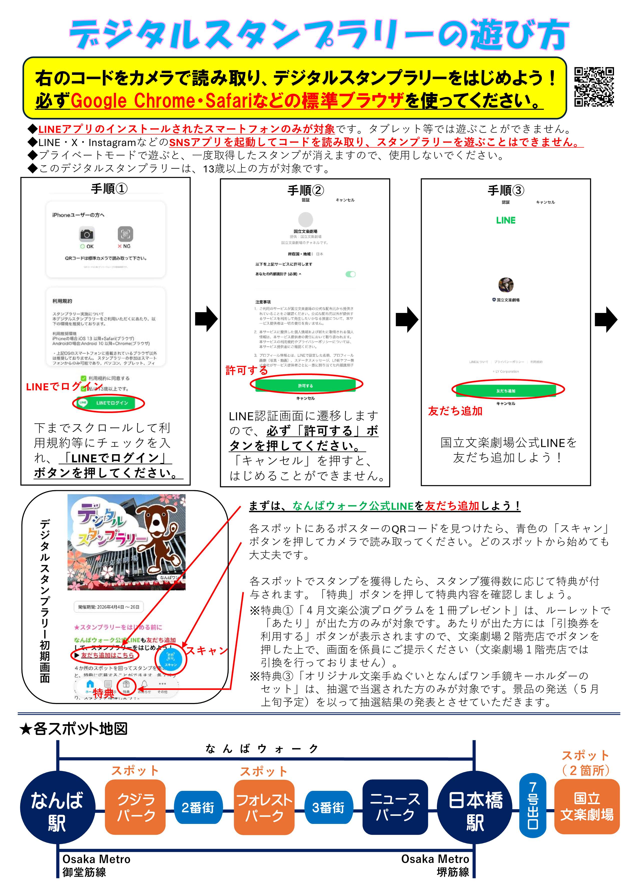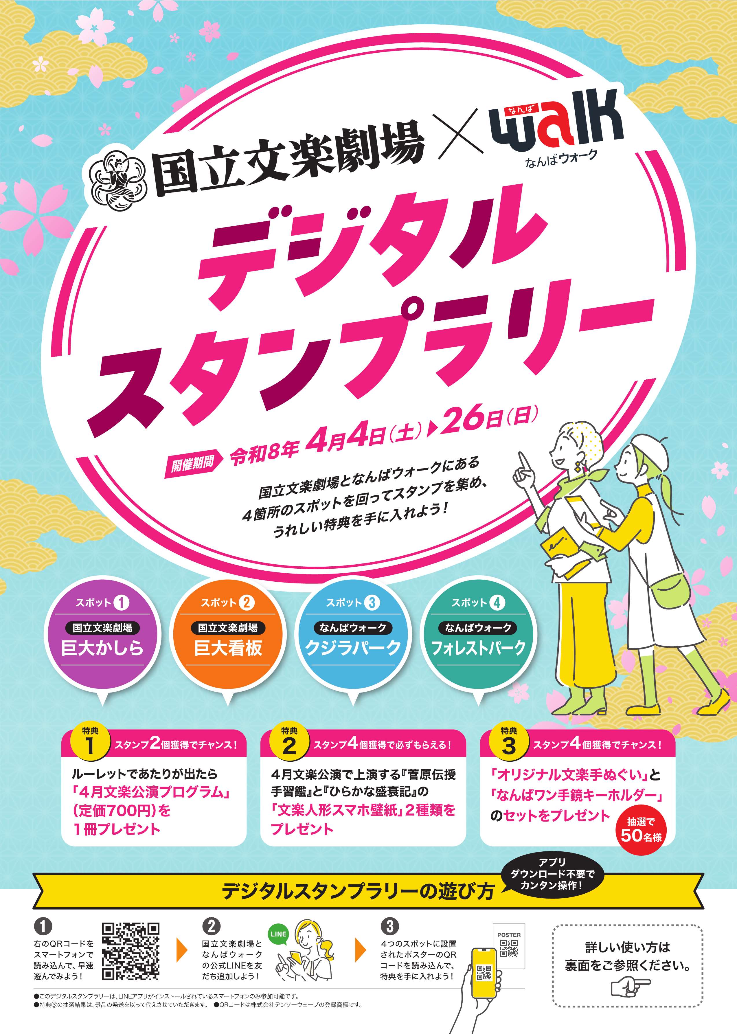 この度、4月文楽公演と同日程の4月4日(土)~26日(日)に、なんばウォーク様と共同でデジタルスタンプラリーを実施します。国立文楽劇場内2か所となんばウォーク内2か所の計4か所のスポットを回ってデジタルスタンプを集め、素敵な特典を手に入れましょう!スポット数4つの手軽なスタンプラリーで、アプリのダウンロードも不要でカンタン操作です。