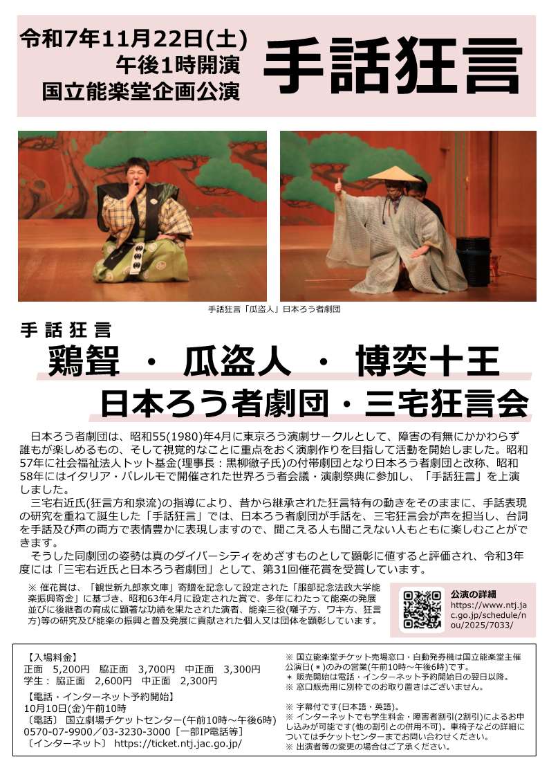 好評発売中の国立能楽堂11月企画公演をピックアップ!(11月22日企画公演◎手話狂言)